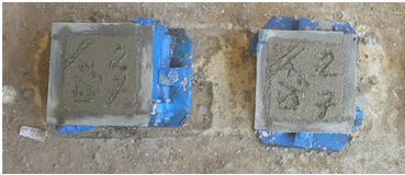 Concrete mixtures were proportioned following the British Standard mix design method to achieve a target characteristic compressive strength of 25 MPa (M25 grade). Six different mix configurations were prepared, as summarized in Table 3. The control mix (NA100) consisted solely of natural uncrushed coarse aggregate (100% NA). The remaining five mixes incorporated varying proportions of GA and GR, with GA100GR0 containing 100% gabbro, GA75GR25 containing 75% gabbro and 25% granite, GA50GR50 containing equal proportions of each, GA25GR75 containing 25% gabbro and 75% granite, and GA0GR100 composed entirely of granite. All mixes were designed with a constant water–cement ratio and identical fine aggregate content to ensure uniformity in evaluating the effect of coarse aggregate composition on concrete properties. For each mix, nine cube specimens (150 × 150 × 150 mm) were cast, see Figure 2. Specimens were demolded after 24 hours and cured in water for 7, 28, and 56 days to assess strength development over time. Fresh concrete workability was evaluated using the slump test in accordance with standard procedures. Compressive strength was measured using a calibrated compression testing machine at each curing age. This experimental program allowed for a direct comparison of the influence of varying gabbro-to-granite ratios on both the fresh and hardened performance of M25 grade concrete.