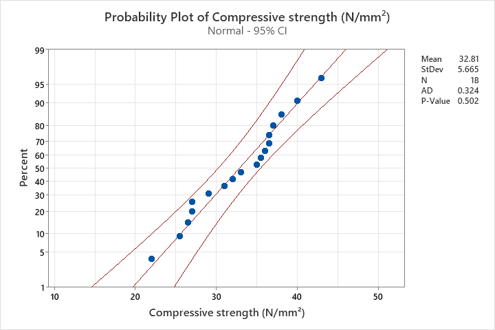 A probability plot was generated to evaluate the normality of the compressive strength data (in N/mm²). This framework was crafted utilizing the preceding experimental data from Table 5 harnessed the capabilities of a versatile statistical software program [Minitab [20] (version 19.0)].